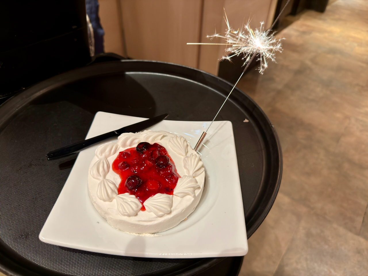 ロボットがハッピーバースデーの曲を奏でながら、花火がついたホールケーキが運ばれてきますw