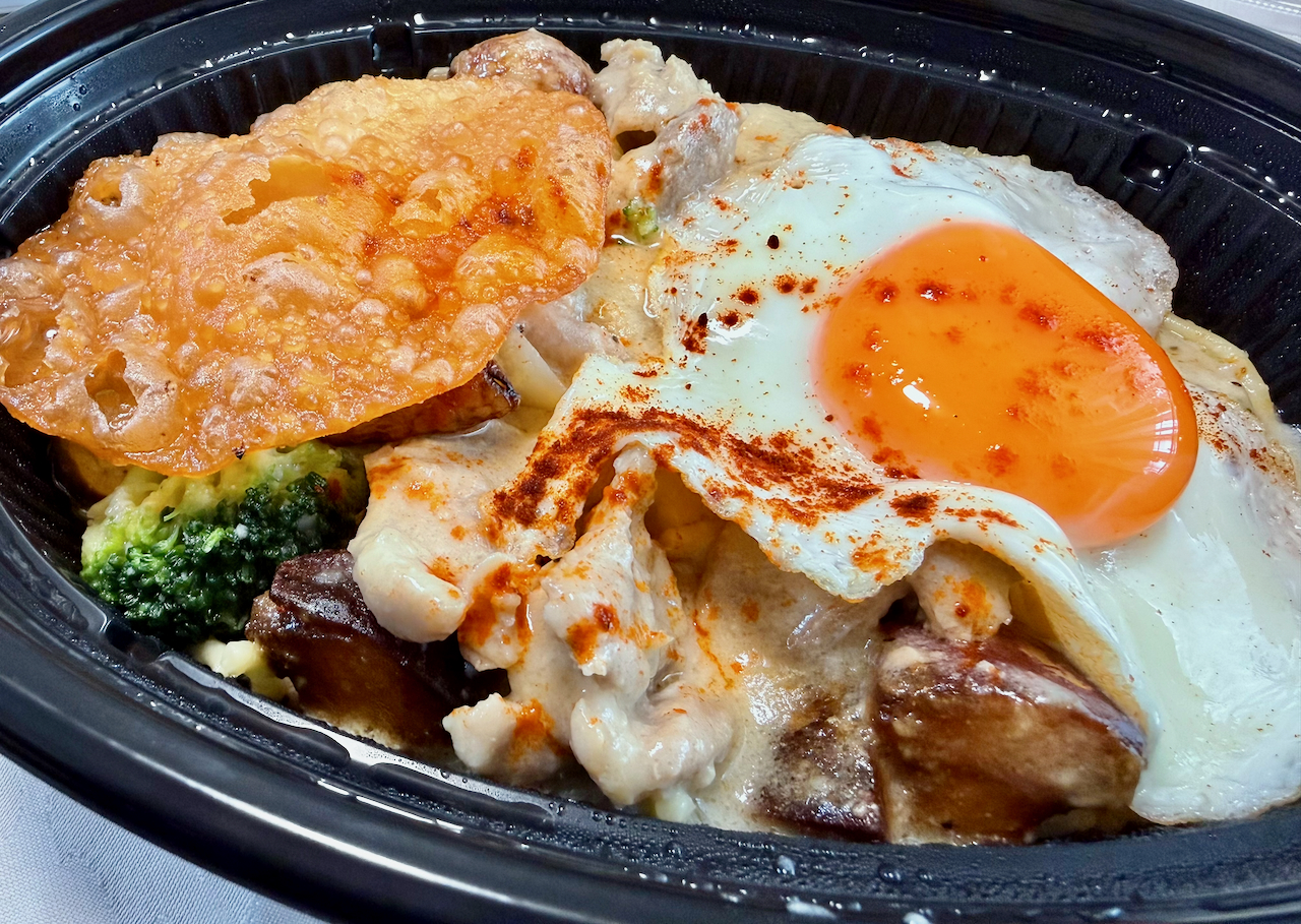 たっぷりのにんにくをベースにしたホワイトクリームに、たっぷりの濃厚チーズを溶け込ませてコクをアップ。シチューナポらしく具材は種類も量もたっぷりと、鶏もも肉・ベーコン・しめじ・ブロッコリー・さつまいものほかに、さらににんにく丸揚げもゴロゴロっと追加しました。トッピングの餃子の皮チップスを砕きながら卵黄と絡めれば食感とコクの両方をもっと味わえます。