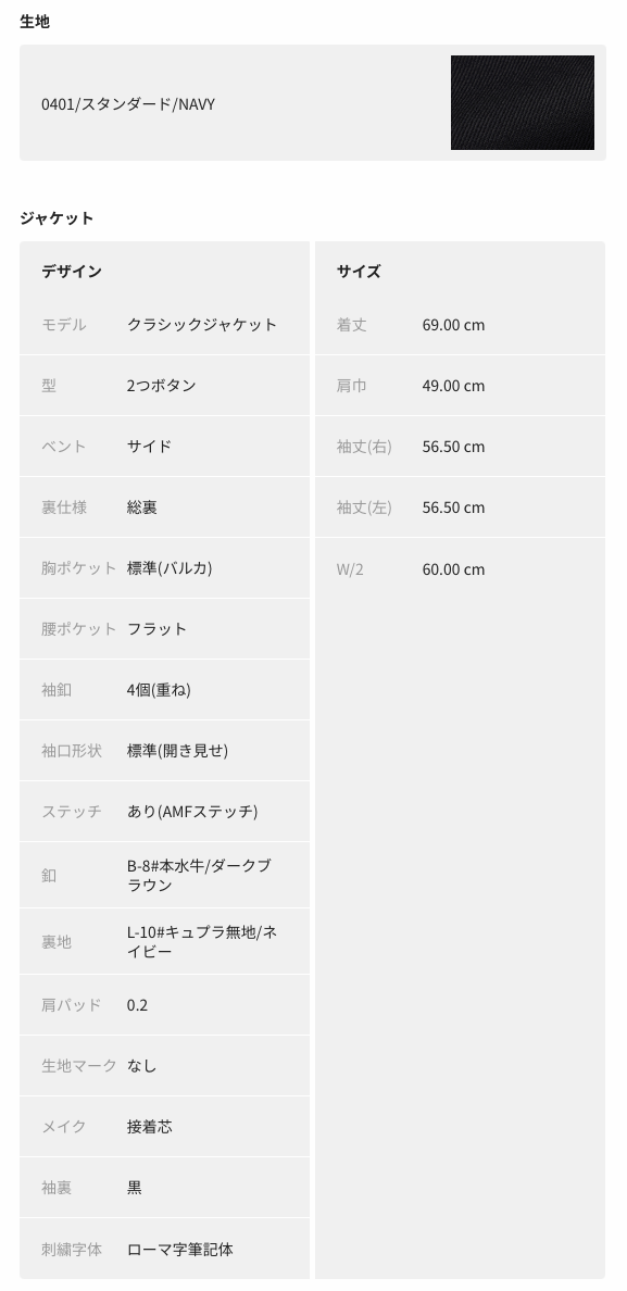 今回私がオーダーしたスーツのジャケットデータ。結構細かいところまでオーダーできるし採寸で調整してもらえるのですよね。